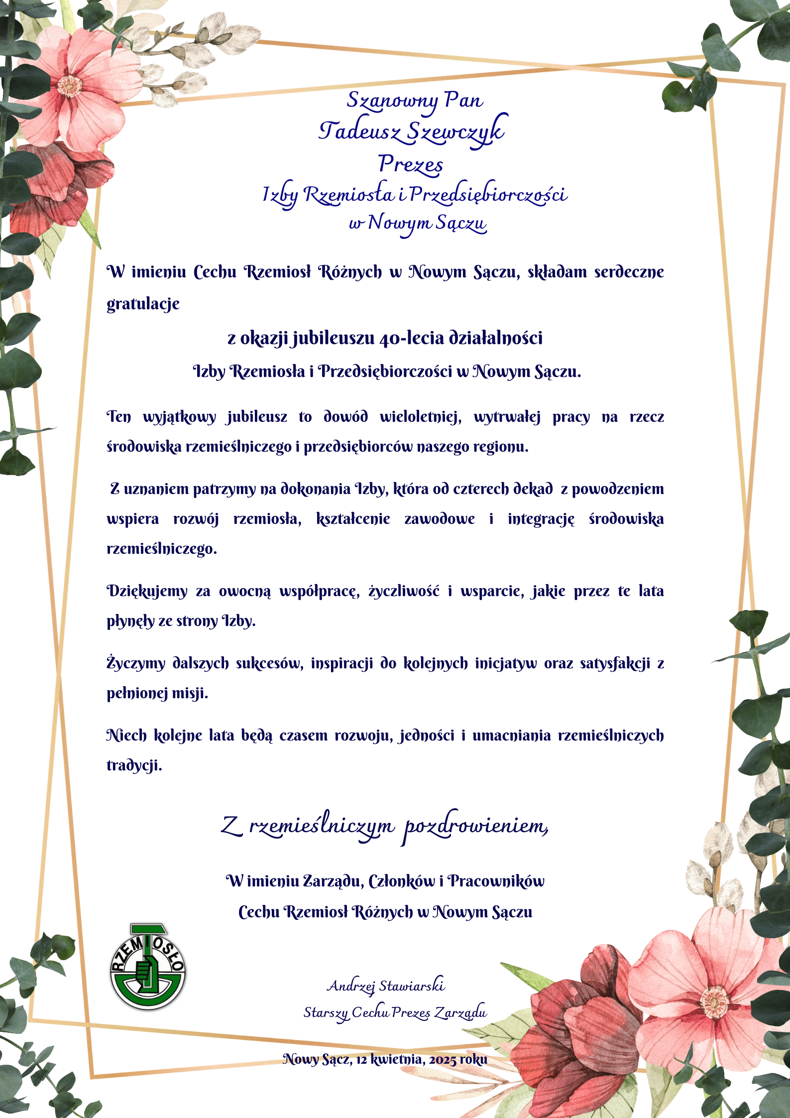 JUBILEUSZ 40-LECIA IZBY RZEMIOSŁA I PRZEDSIĘBIORCZOŚCI W NOWYM SĄCZU – 12.04.2025