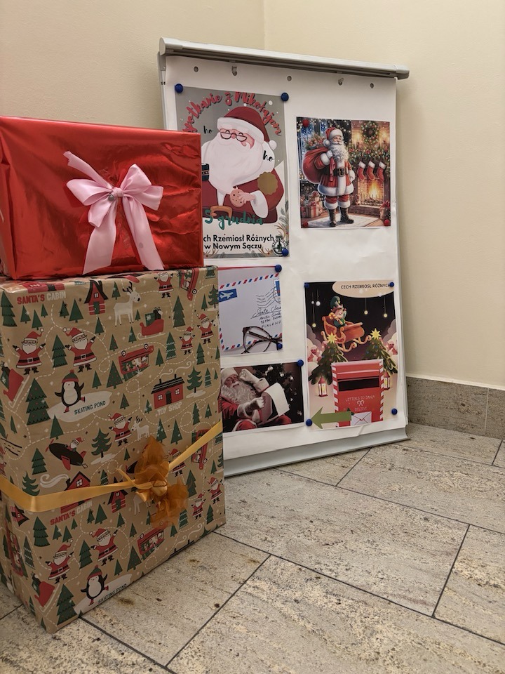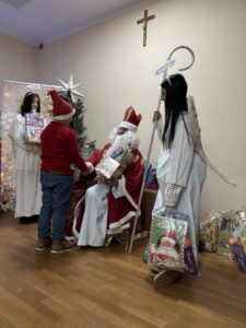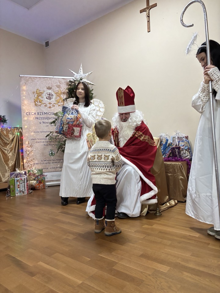 Wieczorem , przyszedł Mikołaj z Aniołami do Cechu, jak co roku – cały w brodzie, a do tego tak głośno tupnął na wejściu, że najmłodsi schowali się za rodziców . Dzieci czekały już niecierpliwie, bo wiedziały, że będą prezenty, piosenki i cała góra radości. Anioły dzielnie pomagały, a Mikołaj co chwilę puszczał oczko i żartował. Śmiechu było co niemiara, a atmosfera jak w najbardziej magiczny, zimowy wieczór.